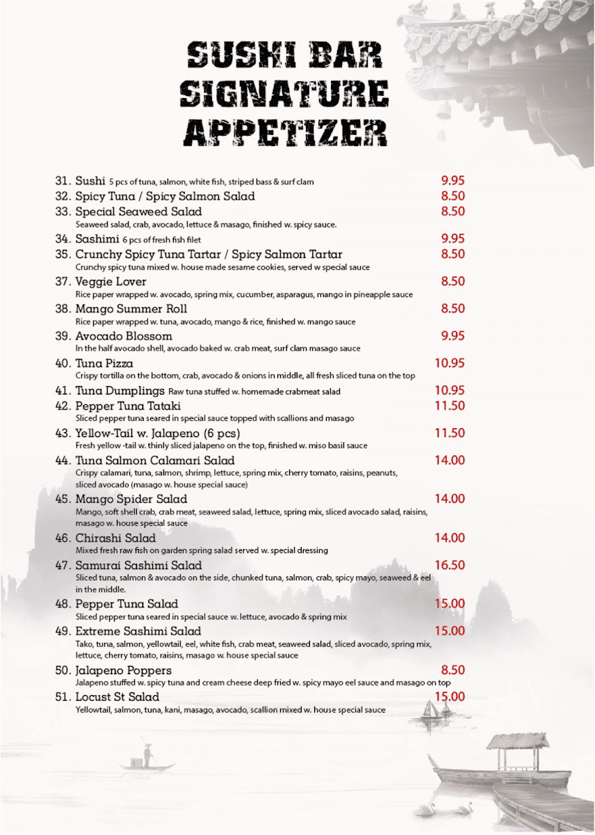 Welcome to Samurai Japanese Restaurant, a hidden gem nestled in the heart of Philadelphia at 1420 Locust St. This culinary haven offers an impressive menu that combines tradition with innovation, delivering high-quality sushi and other Japanese delights.